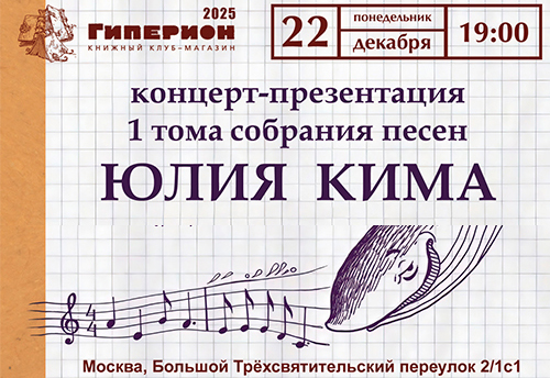 ![]() Вечер песен Юлия Кима в книжном клубе-магазине «Гиперион» 22 декабря (понедельник) 2025 года в 19:00 |
