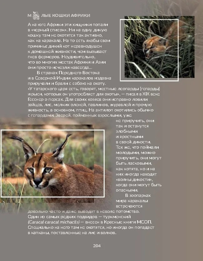 Альбом «Дикие кошки мира» – прекрасный пример такого восхищения. Искреннее любование каждой особью, попавшей в объектив, трепетное внимание ко всем повадкам, умение и картинкой и словами передать чудесные мгновенья жизни вольных существ делают это издание не просто познавательным и красивым, а по-настоящему уникальным. В нем есть все: экскурс в палеонтологию с доказательством происхождения всех кошек от единого предка, их современная классификация, научно-популярное описание каждого вида и его ареала. А также такие замечательные фрагменты: