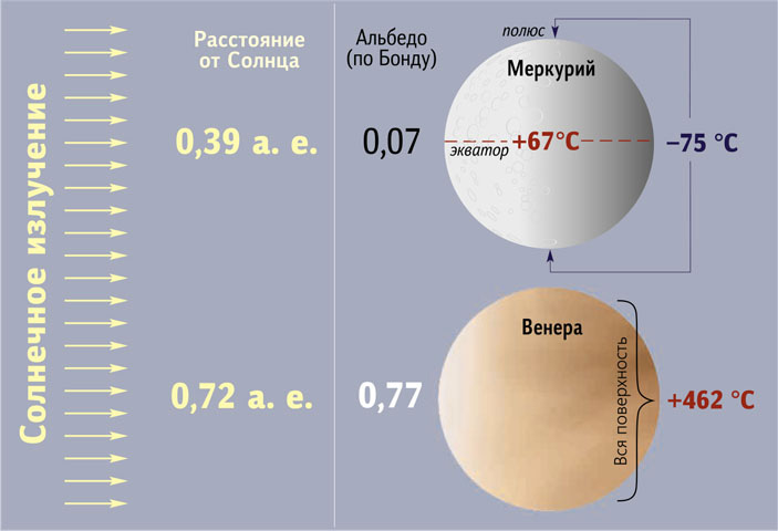 Посмотрим на две ближайшие к нам планеты — Меркурий и Венеру. На первый взгляд ситуация парадоксальная. Венера отражает почти 80% солнечного света и лишь около 20% поглощает, а Меркурий почти ничего не отражает, а всё поглощает. К тому же Венера дальше от Солнца, чем Меркурий; на единицу ее облачной поверхности падает в 3,4 раза меньше солнечного света. С учетом разницы в альбедо каждый квадратный метр твердой поверхности Меркурия получает почти в 16 раз больше солнечного тепла, чем такой же участок на Венере. И тем не менее на всей твердой поверхности Венеры адские условия — огромная температура (олово и свинец плавятся!), а Меркурий прохладнее! На полюсах там антарктический холод, а на экваторе средняя температура +67°C. Конечно, днем поверхность Меркурия нагревается до 430°C, а ночью остывает до ?170°C. Но уже на глубине 1,5–2 метров суточные колебания сглаживаются, и мы можем говорить о средней температуре поверхности +67°C. Жарковато, конечно, но жить можно. А в средних широтах Меркурия вообще комнатная температура.