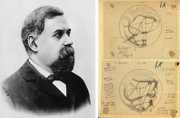 | Рис. 4.39. Джованни Скиапарелли. Рис. 4.40. Зарисовки каналов на Марсе, выполненные Дж. Скиапарелли |