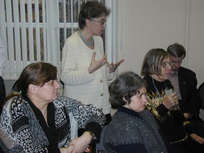 | 6 декабря 2003 года прошел V Круглый стол "Права человека=права инвалидов", посвященный Международному дню инвалидов. Обсуждали вопросы участия слепоглухих избирателей в кампании по выборам депутатов Государственной Думы РФ; организации работы с глухими москвичами в рамках районных клубов глухих; проблемы получения индивидуальных технических средств реабилитации и другие вопросы. По окончании заседания все участники отправились в кафе "Русское бистро". |